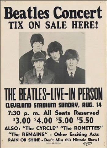 | One of the Beatles better and wilder concerts from their 1966 tour from what I have read and only a week before the Beatles Shea Stadium concert. Same photo as the Beatles Shea Stadium concert poster of 1966, but a different poster maker; very effective and simple design in black and white, one of my favorite original Beatles concert posters. |