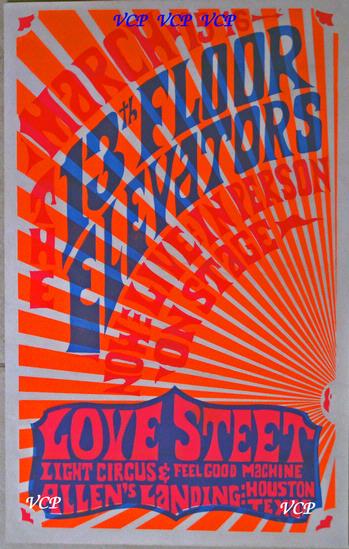 An extremely rare Texas psychedelic poster with only 3 known copies to exist, so finding one or finding someone to part with their poster is more than difficult. The 13th Floor Elevators were a terrific Texas psychedelic rock band lead by singer Roky Erickson (a story in itself) and the band was a regular at the Vulcan Gas Company located in Austin, Texas which produced some of the best of psychedelic posters and art of the sixties.