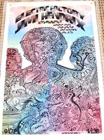 This particular poster is extremely rare as it was printed on very thin paper and used to paste on billboards, so getting one off a wall was not only extremely difficult but almost impossible without ripping it apart. The art on this poster is extremely detailed with a collage of detailed gears making up the image of Jimi Hendrix and the Experience. The subtle rainbow fountain printing is the perfect color for such an artistic design and the completed poster with the Electric Factory venue could not be better. Certainly is one of the best Jimi Hendrix posters of the Sixties in my opinion.