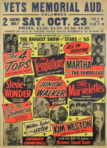 | Will pay record prices for any authentic Motown posters from the 60's. There tours were brief, but great acts such as Marvin Gaye, Stevie Wonder, The Supremes, Four Tops, Temptations and others. This Biggest Show of Stars for 1965 was held at Vets Memorial Auditorium, Columbus, Ohio - October 23, 1965; printed by Globe Posters of Baltimore |