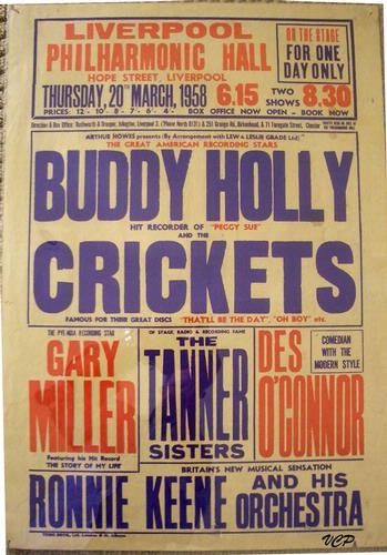 | Buddy Holly and the Crickets were very big in England and this tour in 1958 was considered a success. Not many of the English posters survied since they were printed on thin paper and usually pasted to walls as advertising. This poster was pulled with little to no damage to the poster and with the glue and bit of the wall still intact on the back. Nice looking traditional boxing style poster; but what makes this poster special is Buddy Holly and the Crickets, along with their hit songs listed! |