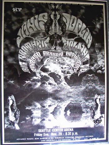 | Seattle produced some excellent posters, this being one of the best for Janis Joplin - sliver, metallic in design, cardboard, and photos by Bob Seiderman. What a great poster - by this time, Janis had become the headliner and shortly thereafter went solo, which was a real shame in my opinion. In comparison, Jim Morrison of the Doors had also become a headliner, but Jim never allowed himself to be put above the group. |