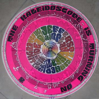 | Number 1 in the series of round posters produced for the Kaleidoscope in Los Angeles. This was a great dance/concert venue with the stage being round and rotating from what I have been told. The Kaleidoscope posters are very impressive as a whole collection which I will be showing in a separate gallery soon. Why they opened with two of the favorate bands of the Bay area vs. local groups seems a bit of a mystery to me, but hey - who wouldn't want go see the Dead and Airplane playing on the same bill together! |